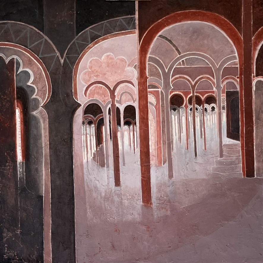 This recent series of paintings is more boldly representational than most of my previous work. On a recent visit to Cordoba, Andalusia, I spent time walking and drawing inside the ‘Mesquita’, the Great Mosque. The curves of the arches chimed with the introduction of more curved forms into my work generally. These paintings are not meant as literal transcriptions of the building; I use the abstract principles I am used to working with as I seek to convey the feelings of infinity and endless space that I experienced there, walking quietly through the forest of a thousand ancient columns.